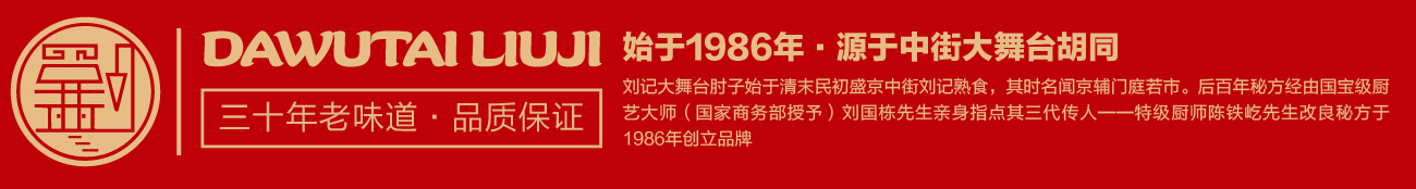 盛京,昔乃大清王朝發(fā)祥之地。劉記大舞臺肘子始于清末民初盛京中街劉記熟食,其時名聞京輔門庭若市。后百年秘方經(jīng)由國寶級廚藝大師(國家商務(wù)部授予)劉國棟先生親身指點其三代傳人——中國烹飪大師劉家驥之徒中國烹飪大師陳鐵屹先生改良秘方,于1986年創(chuàng)立品牌。劉記大舞臺經(jīng)營的產(chǎn)品涵蓋招牌熏肘,豬蹄,燒雞等系列,產(chǎn)品色澤潤嫩、酥美可口、吮指尤香、譽滿沈城,遂成古今絕味,其獨特的風味深受沈城百姓喜愛。經(jīng)過三十余年的沉淀發(fā)展,劉記大舞臺品牌也成為了沈陽地標美食文化名片之一。